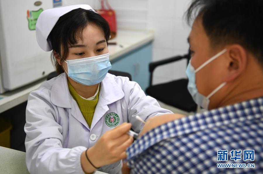 1月20日,在合肥市肥西县上派镇中心卫生院预防接种门诊,医护人员为接种人员注射疫苗。