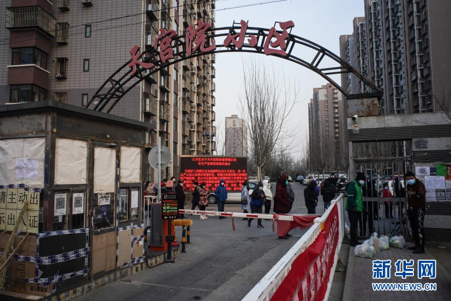 1月20日,人们在天宫院小区出入口收送物资。