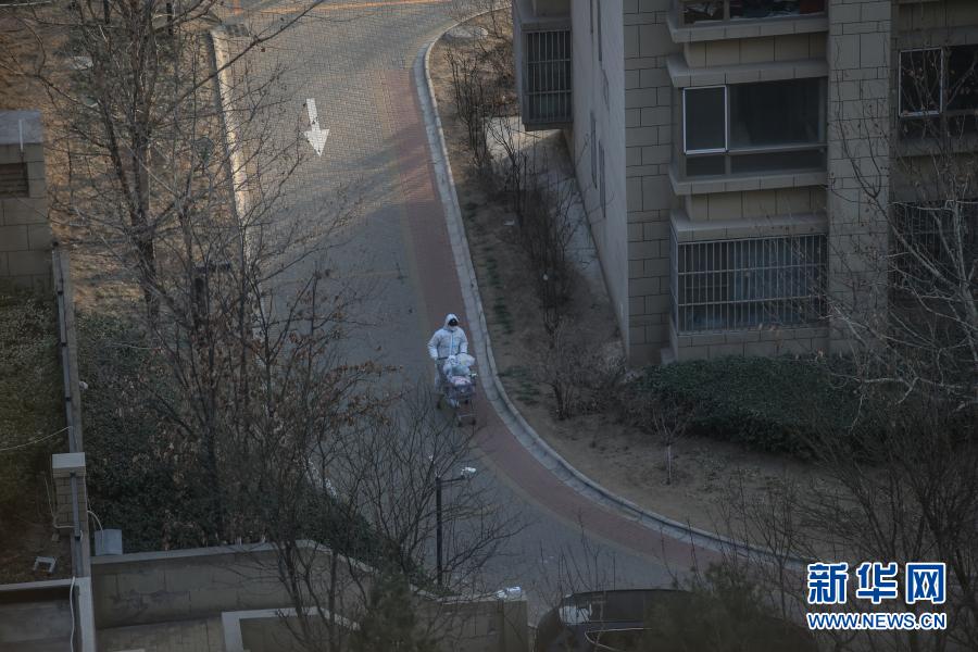 1月20日,在融汇社区,穿着防护服的工作人员用小推车将商品送到居民手中。
