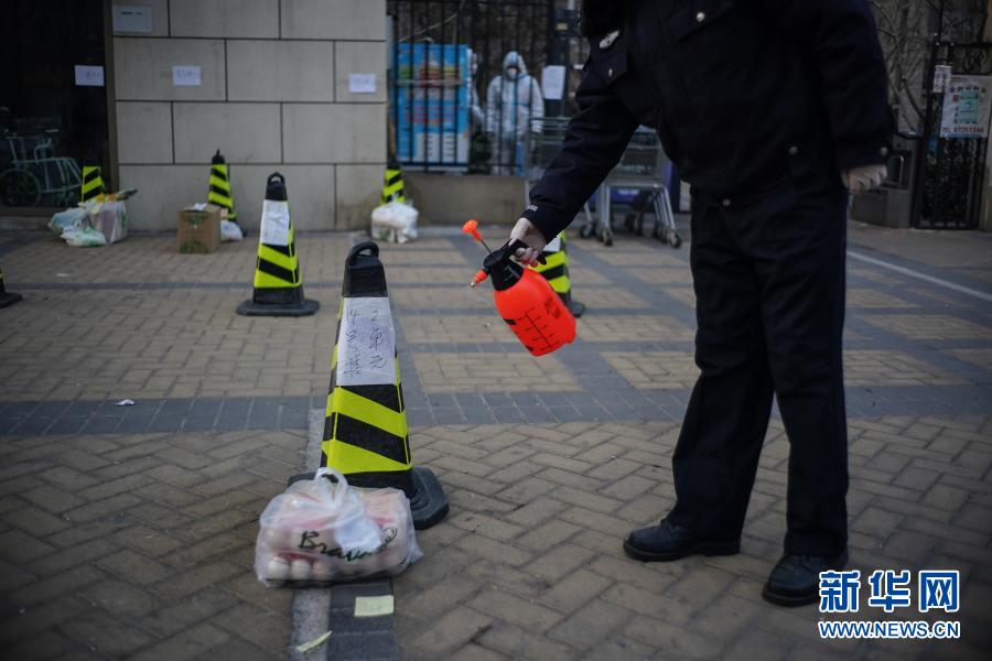 1月20日,工作人员在融汇社区南门外对即将配送的商品进行消杀。