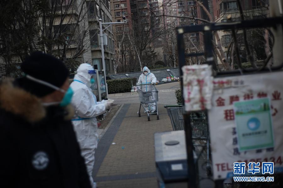 1月20日,在融汇社区南门,穿着防护服的工作人员准备用小推车运送物资。