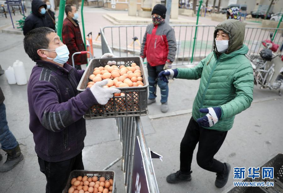 在沈阳市皇姑区塔湾街明廉路疫情重点管控区域物资交接处,工作人员(左)向区域内搬运生活物资(1月6日摄)。