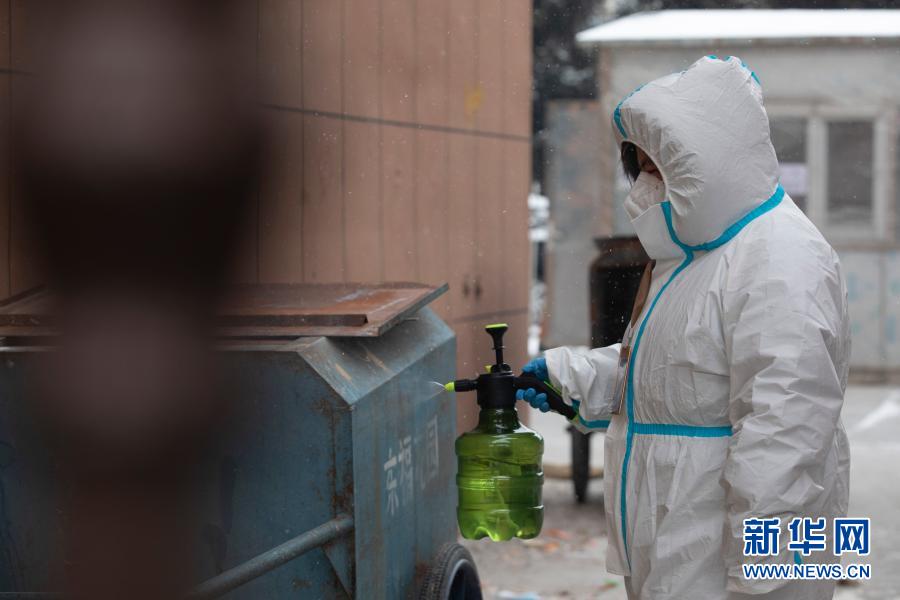志愿者在黑龙江绥化市望奎县一小区内对垃圾箱进行消杀(1月17日摄)。