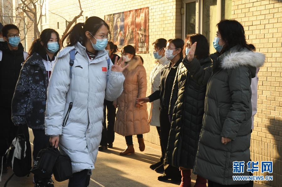 1月21日,中国农业大学附属中学初三年级学生在离校前与老师告别。