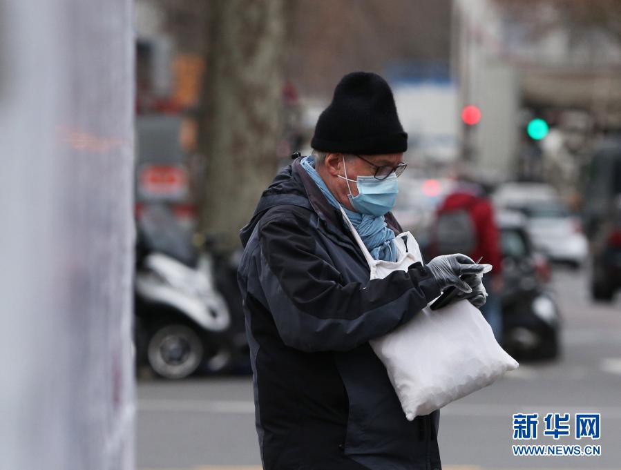 1月20日,在法国巴黎街头,一名等红灯的老人戴着口罩和塑料手套。新华社记者 高静 摄