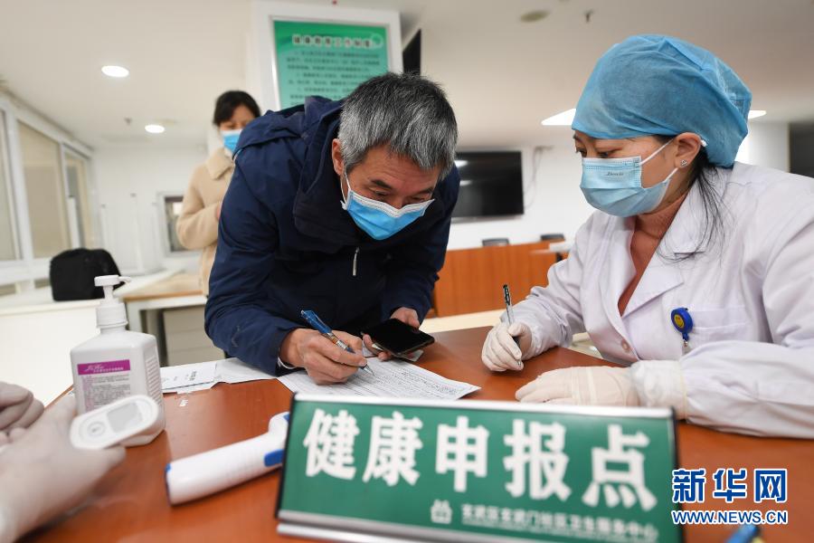 1月21日,在南京市玄武区玄武门社区卫生服务中心,来自江苏省肿瘤医院的一线医务人员(左)在疫苗接种前进行健康申报。