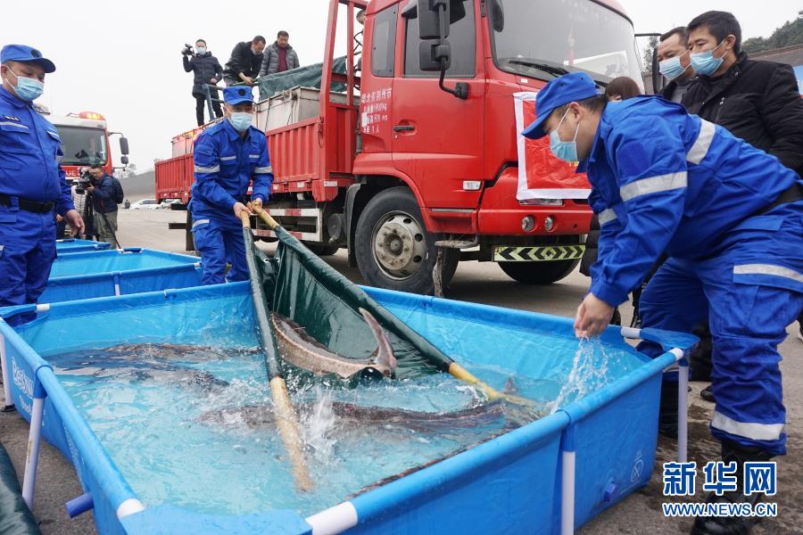 1月21日,工作人员将长江鲟从运输车辆上卸下来,做好放流准备。新华社记者 杨迪 摄