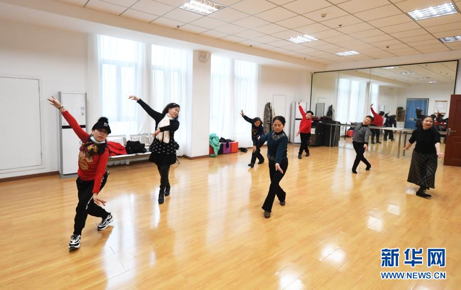 1月21日,几名老人在重庆市渝北区仙桃街道空港佳园社区养老服务站练习舞蹈。