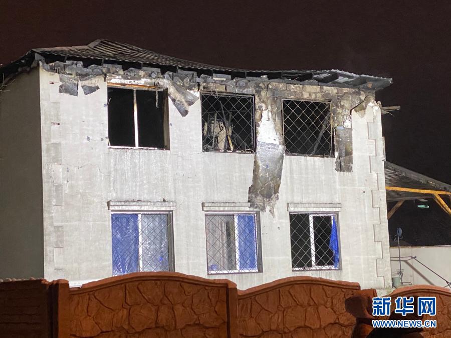 这是1月21日拍摄的乌克兰东部哈尔科夫市发生火灾的养老院(手机照片)。