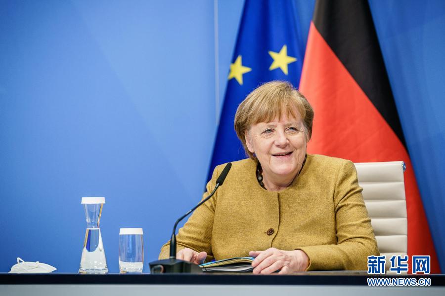 1月21日,德国总理默克尔参加欧盟领导人视频会议。新华社发(欧盟供图)