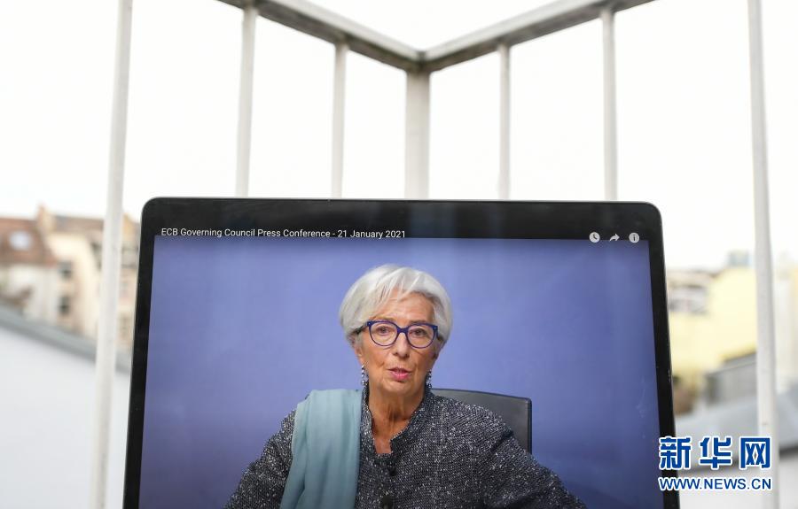 这是1月21日在德国法兰克福拍摄的在此地举行的欧洲中央银行货币政策会议后,欧洲央行行长拉加德出席新闻发布会的视频直播画面。新华社记者 逯阳 摄