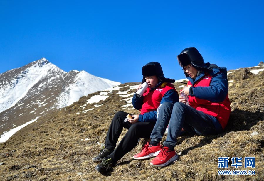1月21日,国家电网西宁供电公司输电运检中心运检人员在巡检途中吃午饭。新华社记者 张龙 摄