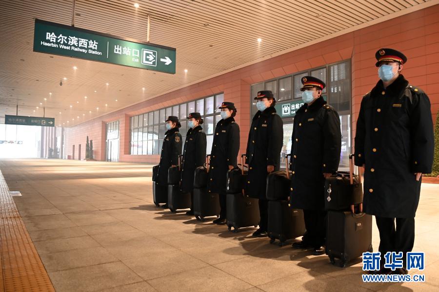 1月22日,在哈尔滨西站站台上,京哈高铁G902次列车的乘务人员在整队准备登车。