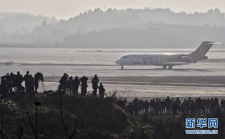 1月22日,参加试飞仪式的成都航空有限公司ARJ21客机降落在成都天府国际机场。新华社记者 刘坤 摄