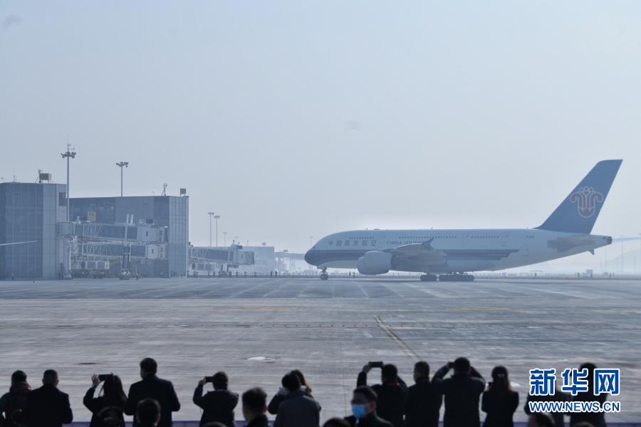 1月22日,参加试飞仪式的中国南方航空集团有限公司A380客机驶向航站楼。