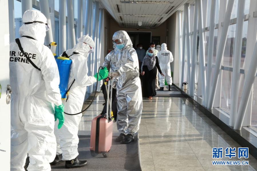 1月21日,在斯里兰卡科伦坡郊外班达拉奈克国际机场,机场消毒人员为乘客的行李消毒。