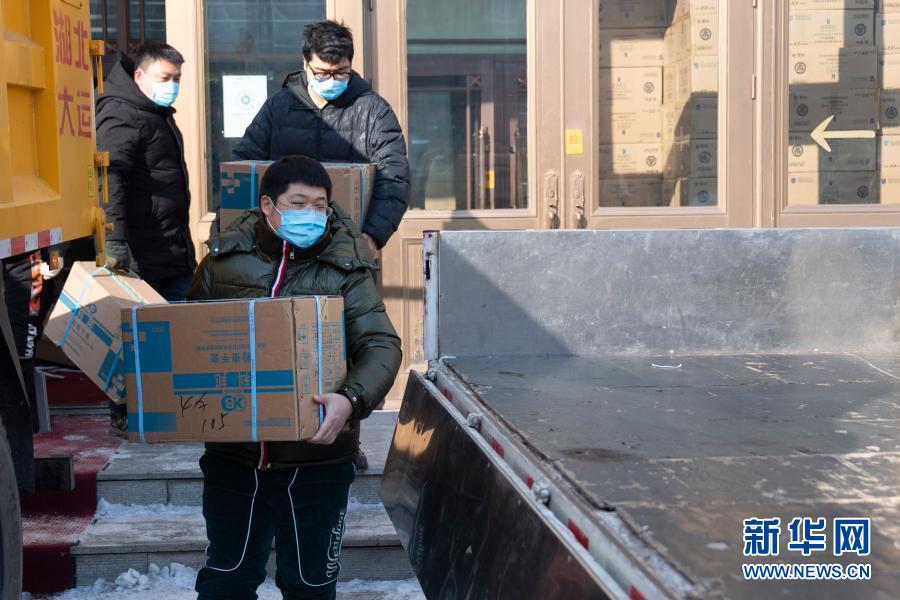 1月22日,在哈尔滨市大同小学校,工作人员在将防疫物资装车。