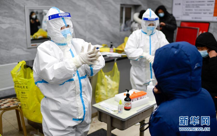 在通化市东昌区一核酸检测点,医务人员在采样前消毒双手(1月20日摄)。