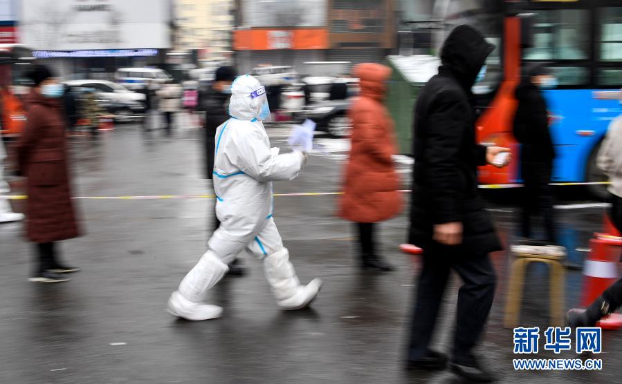 在通化市东昌区一核酸检测点,一名防疫人员在工作中(1月20日摄)。