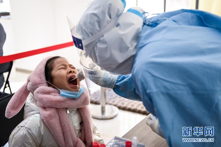 1月22日,小朋友在长春市朝阳区湖西街道开运社区核酸检测点进行核酸检测。