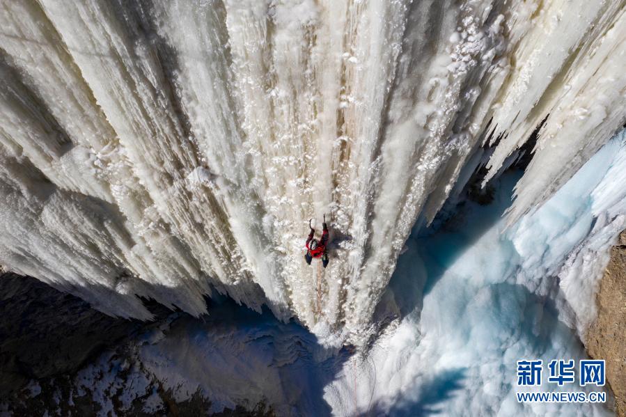 黄煌在冰壁上攀登(1月16日摄,无人机照片)。