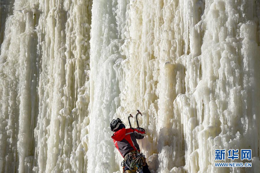 黄煌在冰壁上攀登(1月16日摄)。新华社记者 胡虎虎 摄