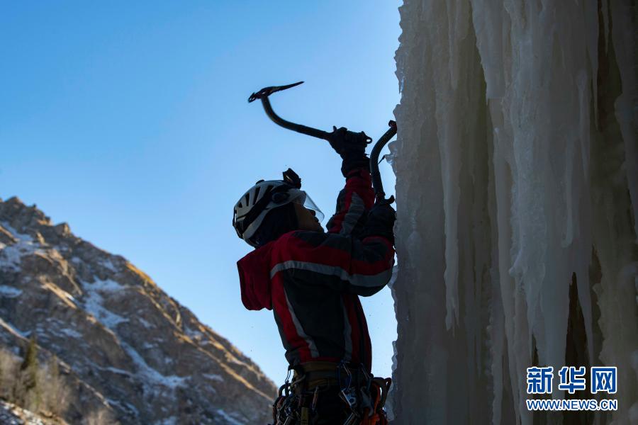 黄煌在冰壁上攀登(1月12日摄)。新华社记者 胡虎虎 摄