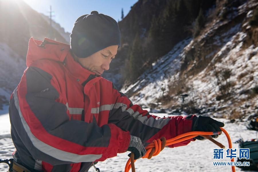 黄煌在攀冰前检查安全绳(1月16日摄)。新华社记者 胡虎虎 摄
