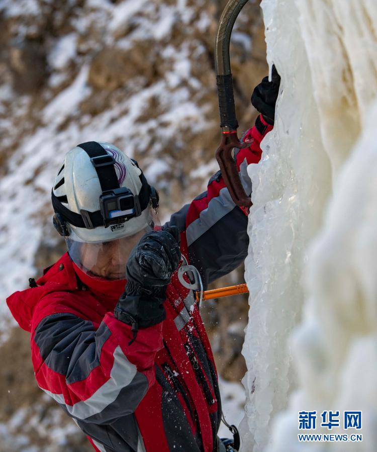 黄煌在攀冰时将冰锥钻进冰壁(1月12日摄)。新华社记者 胡虎虎 摄