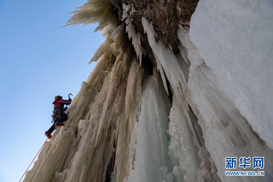 黄煌在冰壁上攀登(1月12日摄)。新华社记者 胡虎虎 摄