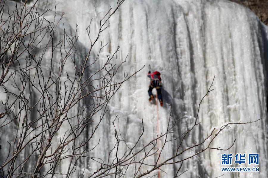 黄煌在冰壁上攀登,即将到达冰顶(1月16日摄)。新华社记者 胡虎虎 摄