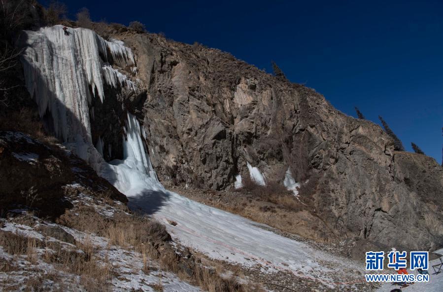 黄煌(左)在攀冰中,冰友陈瑞峰在地面为他做保护(1月16日摄)。新华社记者 胡虎虎 摄