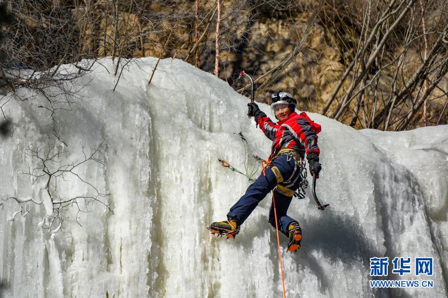 黄煌在冰壁上完成先锋攀爬,搭建完冰顶保护系统后,挥动冰镐向队友呐喊示意(1月16日摄)。新华社记者 胡虎虎 摄