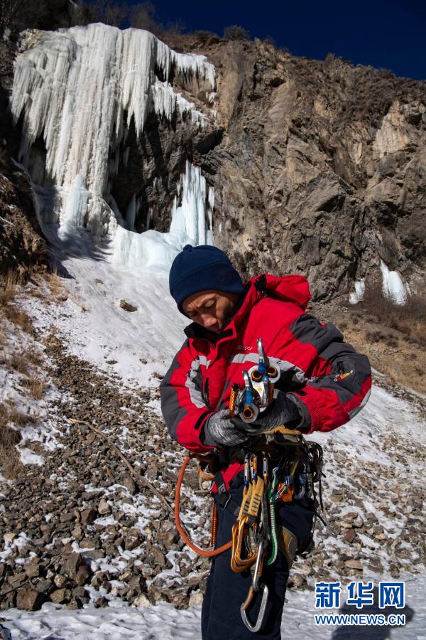 黄煌在攀冰前清点随身用具(1月16日摄)。新华社记者 胡虎虎 摄