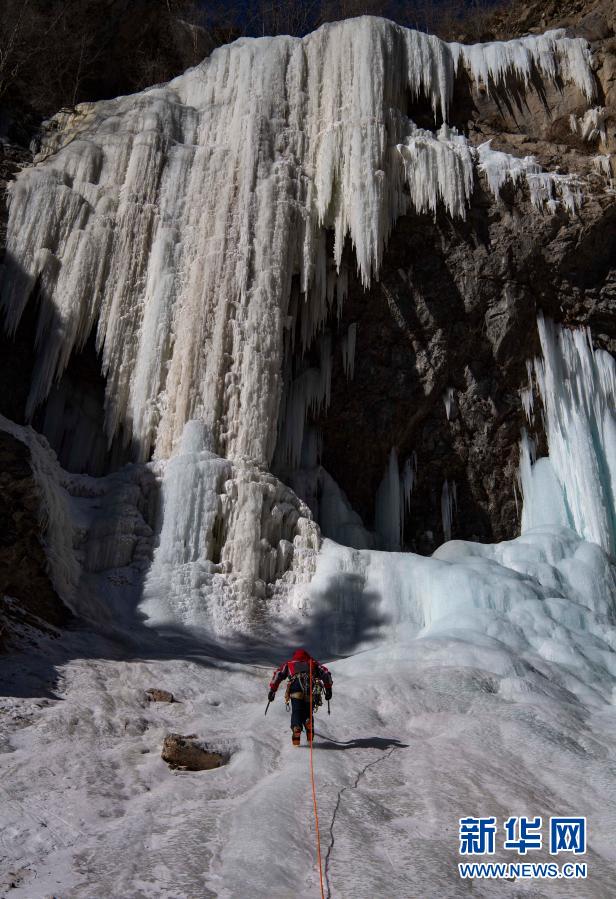 黄煌爬上冰坡,准备开始攀爬(1月16日摄)。新华社记者 胡虎虎 摄