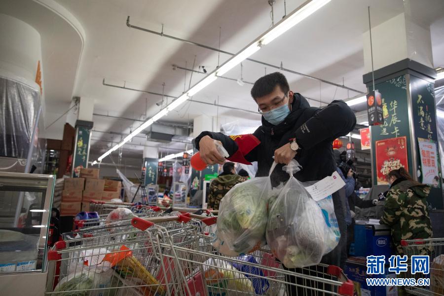 1月22日,工作人员在绥化市华辰超市对准备配送的物资进行消杀。新华社发(张涛 摄)