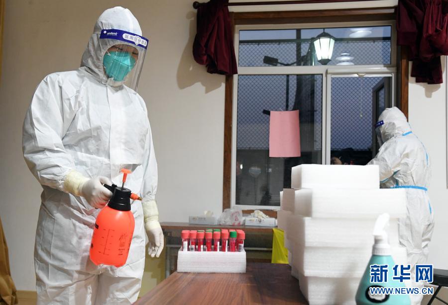 1月22日,在位于北京市西城区展览路街道的一处临时核酸检测采样点,医务人员为装有被检测人员核酸样本的试管消毒。