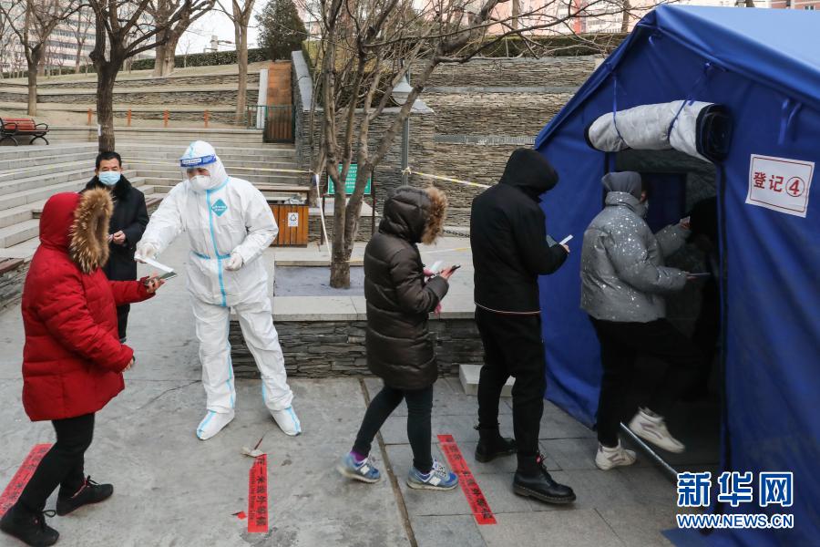 1月22日,在位于北京市西城区广外街道的一处临时核酸检测采样点,工作人员引导被检测人员进行登记。