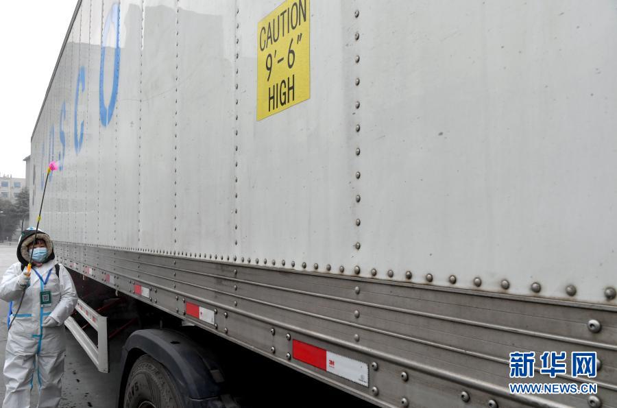 1月22日,在郑州市进口冷链食品集中监管仓(惠济仓),工作人员对冷链运输车进行消杀作业。