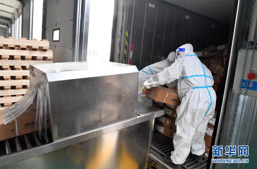 1月22日,在郑州市进口冷链食品集中监管仓(惠济仓),工作人员将进口冷链食品放入自动消毒机。