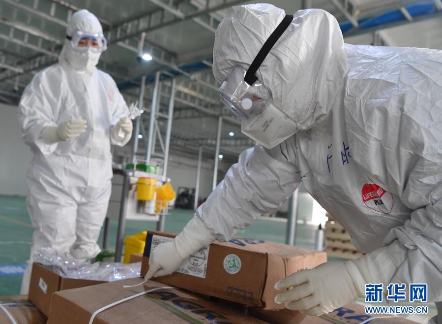 1月22日,在郑州市进口冷链食品集中监管仓(惠济仓),医护人员对进口食品外包装进行抽检采样。