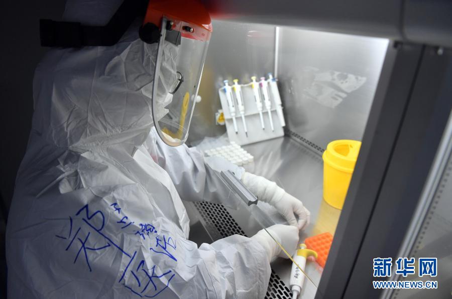 1月22日,在郑州市进口冷链食品集中监管仓(惠济仓)的方舱实验室内,医护人员在做核酸检测前的准备工作。