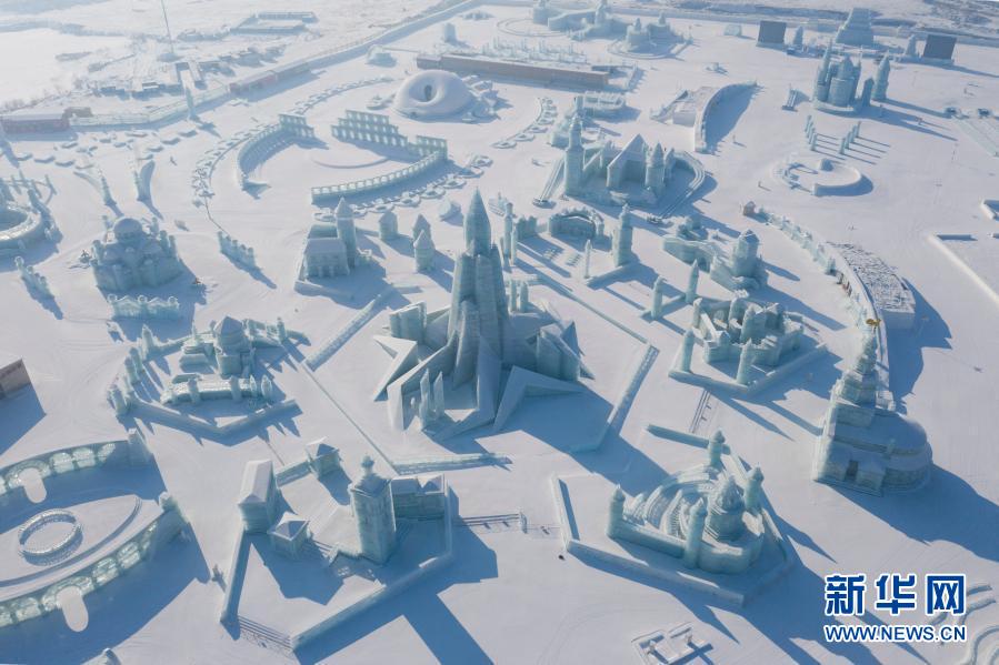 1月22日拍摄的哈尔滨冰雪大世界园区一角(无人机照片)。