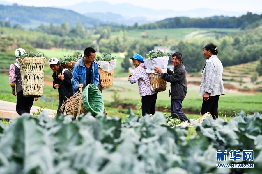 农民在毕节市威宁彝族回族苗族自治县双龙镇红光村的蔬菜基地采收蔬菜(2020年6月17日摄)。新华社记者 杨文斌 摄