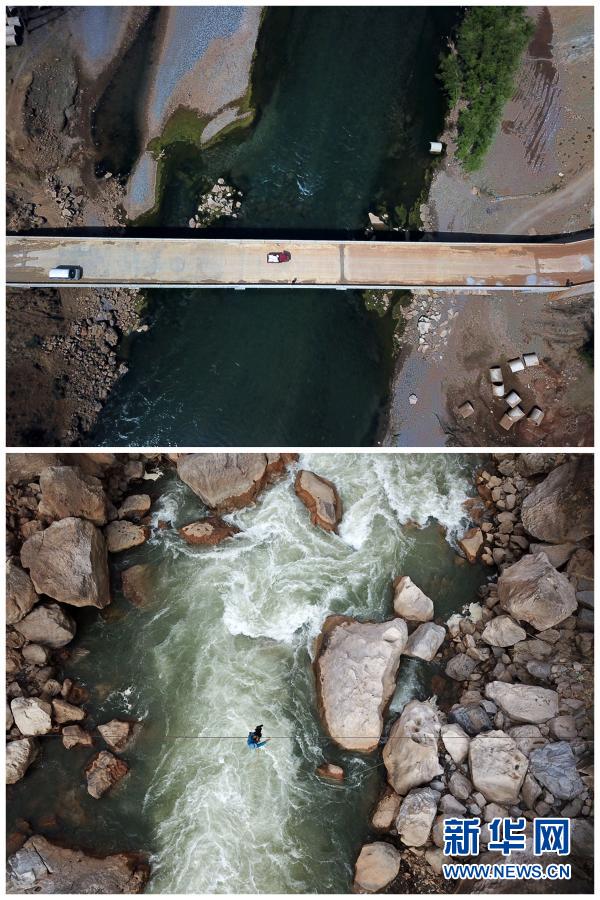 拼版照片:上图为贵州省威宁彝族回族苗族自治县海拉镇海元村“溜索改桥”后的场景(2018年3月12日无人机拍摄);下图为贵州省威宁彝族回族苗族自治县海拉镇花果村的村民利用尚未拆除的溜索过江(2018年3月12日无人机拍摄)。新华社记者 杨文斌 摄