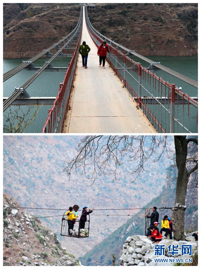 拼版照片:上图为云南省会泽县马路乡的村民通过跨江人行桥到贵州省威宁彝族回族苗族自治县(2019年12月11日摄);下图为云南省会泽县火红乡的村民乘坐溜索到贵州省威宁彝族回族苗族自治县(2013年3月7日摄)。新华社记者 杨文斌 摄