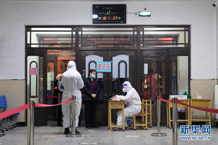 1月22日,在哈尔滨市奋斗小学,医务人员为市民登记身份信息。