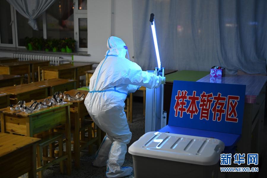 1月22日,在哈尔滨市奋斗小学,医务人员对部分医用器具进行紫外线消毒。
