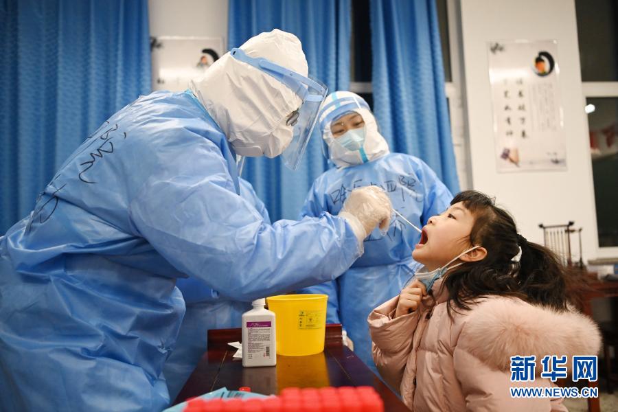 1月22日,在哈尔滨市第一五六中学,医务人员采集核酸样本。