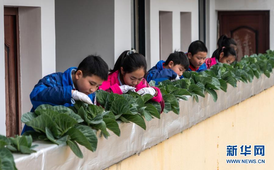 1月22日,高溪小学的学生们在教学楼走廊上为蔬菜手工除虫。学生们在两个多月的时间中完整参与了从幼苗萌发到蔬菜生长、移栽、防治病虫害的全过程,并且还将自己的所见所闻、所做所感以观察日记的形式逐一记录。